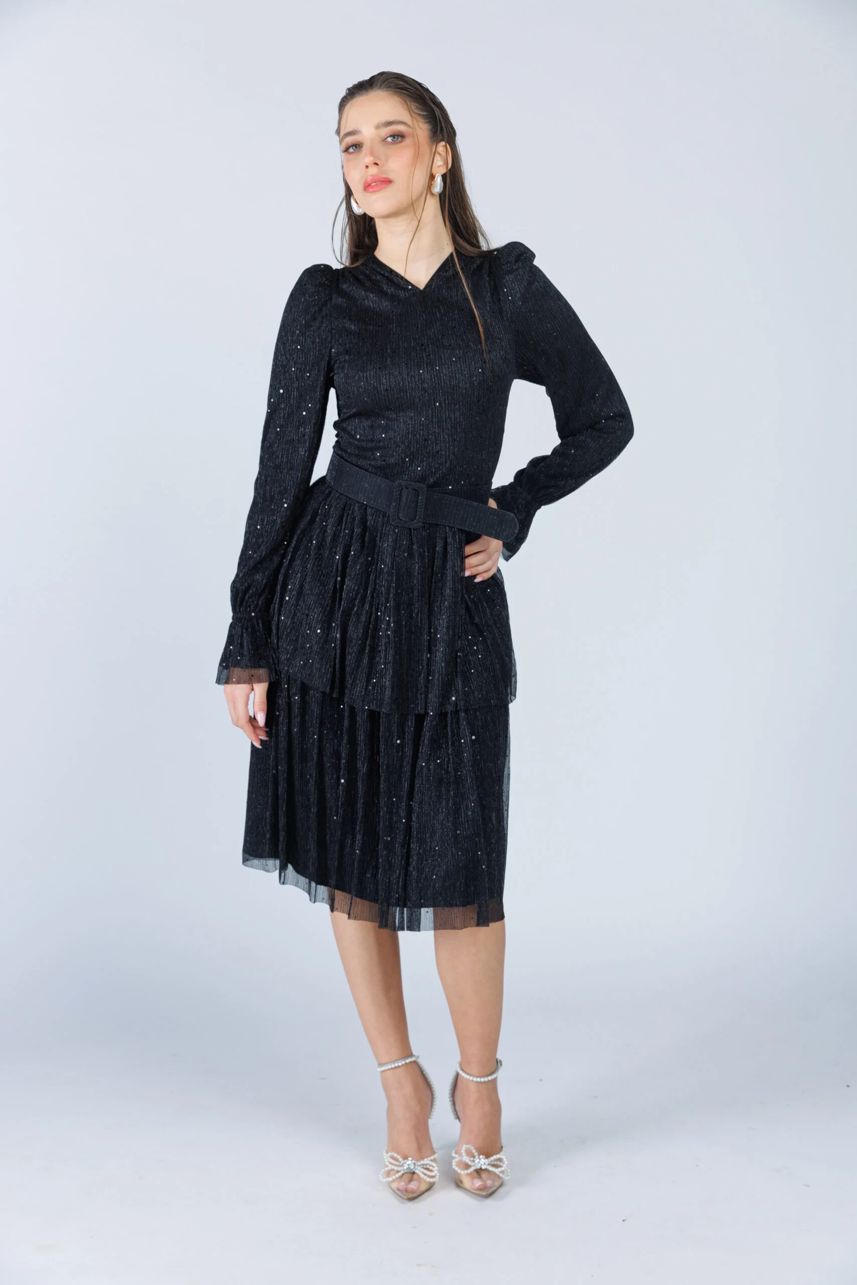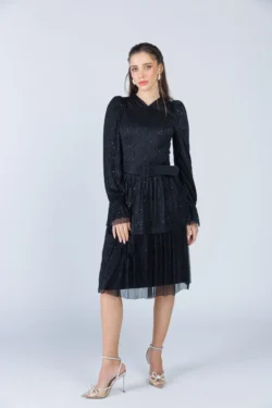 שמלה צנועה לשבת מבד טול מנצנץ,