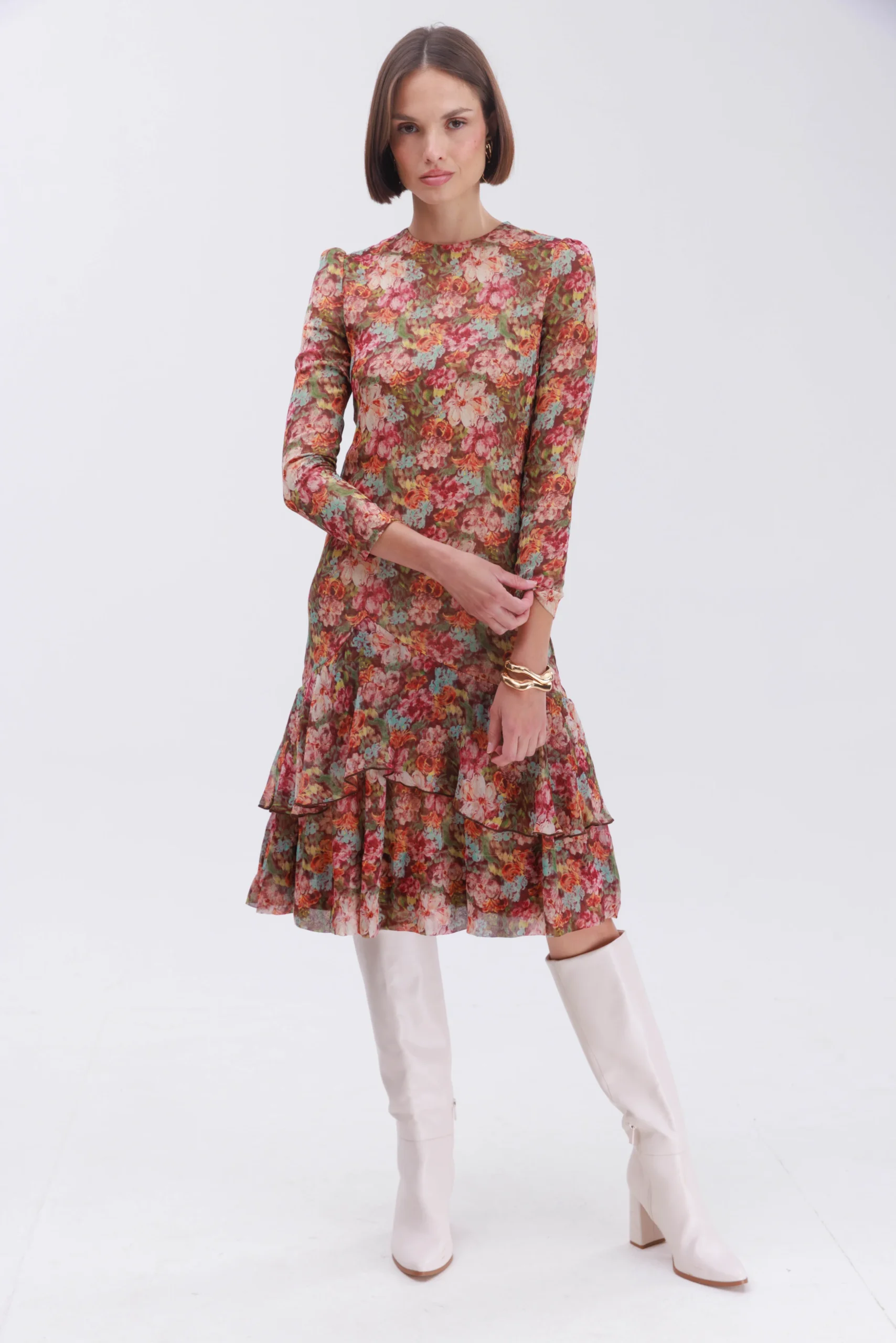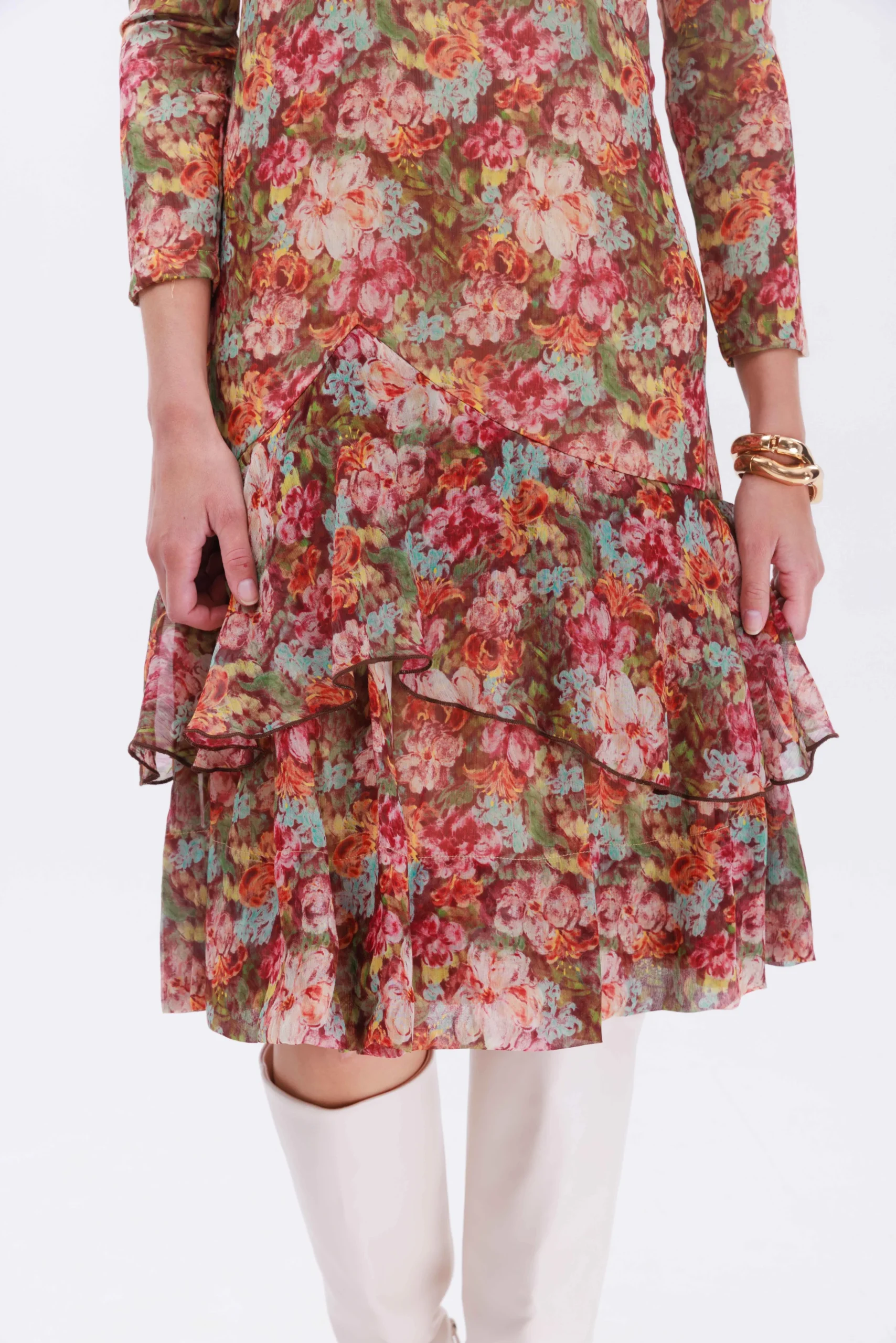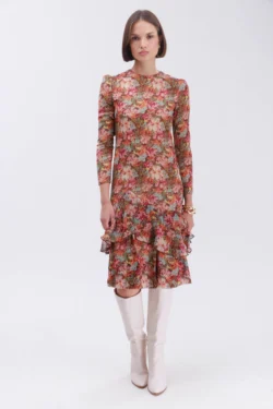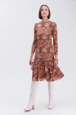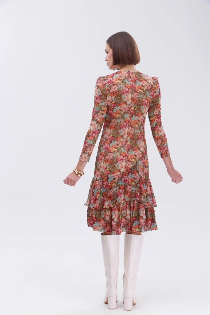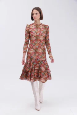 שמלה מבד שיפון בהדפס פרחים על גווני החום.